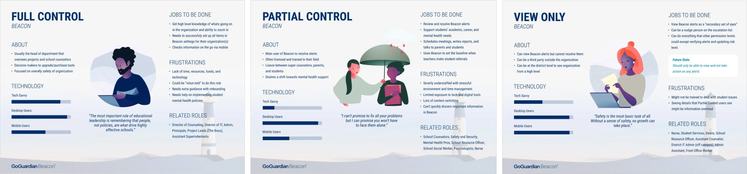 I wanted to dive deeper into the different customer types that would be using the new dashboard and facilitated a workshop with stakeholders who had extensive knowledge of the Beacon customer base. This workshop included the General Manager of Beacon, Product Manager, Customer Support, and Implementation Specialist. The goal of the workshop was to identify specific user types and their permissions levels depending on user goals, frustrations, influences, environment, and roles. Three different personas were created based on the activity.